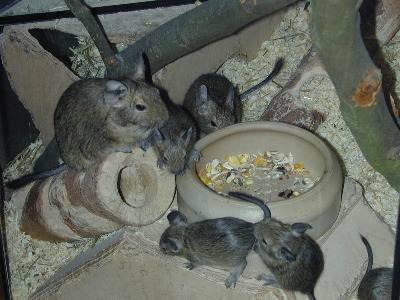 Schon im Alter von ca. drei Monaten sind Degus geschlechtsreif. Meist kommen etwa fünf Junge nach einer Tragzeit von etwa 85 Tagen zur Welt. Degunachwuchs ist besonders faszinierend zu beobachten, da die Tiere ein sehr ausgeprägtes Sozial- und Spielverhalten zeigen. Nach spätestens sechs Wochen sind die Jungtiere entwöhnt und selbständig. | |||||||